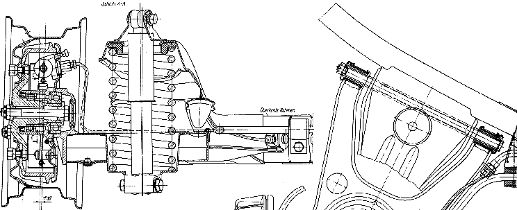 Kupplung, Getriebe, Motor-Getriebe-Aufhängung Die beim Baumuster 312 zur Anwendung kommende Kupplung trägt die Typenbezeichnung LR 10-13 K und ist gegenüber der bis- herigen Ausführung im Nenndrehmoment von 16 auf 14 kpm herab- gesetzt. Diese Maßnahme dient der Verminderung der Ausrückkraft und des Eingriffsstoßes und somit der Erhöhung des Fahrkomforts. Das beibehaltene Vierganggetriebe des Baumusters 311 mit Sperr- synchronisierung des 2. bis 4. Ganges und sperrbarem Drehfeder- freilauf ist im Achsantrieb der neuen Reifengröße angeglichen, während die Übersetzungen der einzelnen Gänge unverändert blie- ben. Die sich daraus ergebenden Gesamtübersetzungsverhältnisse sind in Tafel 1 enthalten. Der Motorgetriebeblock ist unter Berücksichtigung der vorliegenden Einbauverhälnisse nach hinten um 5° geneigt eingebaut. Die Auf- hängung erfolgt in drei Punkten durch Gummimetallager, so daß die Triebwerkvibrationen wirksam in allen Betriebsbereichen ge- dämpft werden. Die Dreipunktaufhängung ist so angeordnet, daß die Auflagepunkte unter Berücksichtigung der Reaktionskräfte des Antriebs annähernd gleich belastet werden und sich ihre Auflage- ebene mit der Hauptträgheitsachse des Motorgetriebeblockes deckt. Das wird erreicht, indem zwei Auflagepunkte mit schräg einge- bauten und dadurch auf Druck und Schub beanspruchten zylin- drischen Gummifedern an breiten Auslegern in Höhe des hinteren Drittels des Motors eine breite Auflagebasis bilden bei gleichzeitiger seitlicher Abstützung, während eine dritte Gummifeder am hinteren Getriebeende den Antriebsblock abstützt und gleichzeitig die Längs- kräfte aufnimmt. Das diese Gummifeder aufnehmende Freilauf- gehäuse am Getriebe ist entsprechend konstruktiv umgestaltet. Karosserie und elektrische Anlage Die Karosserie und damit auch die elektrische Anlage sind bis auf die durch das neue Fahrgestell geänderten Anschlußmaße der Boden- anlage unverändert beibehalten. Hervorgehoben sei lediglich, daß die Türinnenverkleidung beim neuen Baumuster mit gepolsterter, hochfrequenzgeschweißter PVC-Folie in geschmackvollen Dessins ausgeführt sind, die bei der Luxusausführung eine zusätzliche farbliche Absetzung aufweisen. Anstelle der dabei in Fortfall gekom- menen seitlichen Türtasche ist auf der Beifahrerseite unterhalb der Instrumententafel eine Netzablage angebracht. MA 8478 |